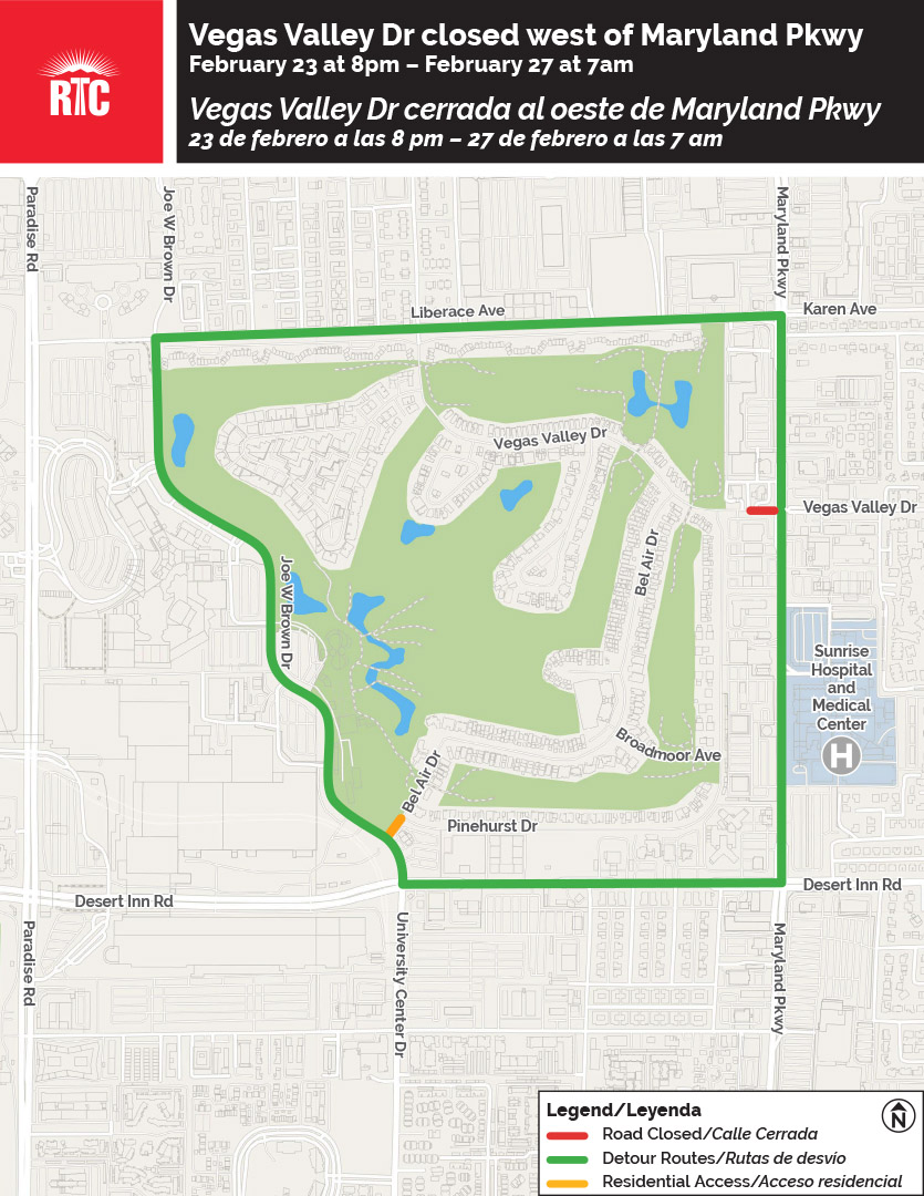 From Monday, February 16 at 8pm through Friday, February 20 at 7am, Vegas Valley Dr will be closed west of Maryland Pkwy. Crews will be installing a new storm drain in the area. Click here for detour information.